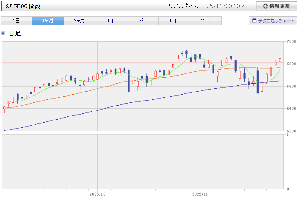 出典:楽天証券 11月のS&P500は最終的に6800ポイント近くまで回復しました。
