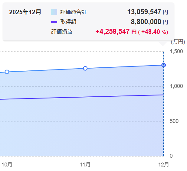 含み損の期間も売ることなく積立を継続したため、回復期に資産が急上昇しました。
