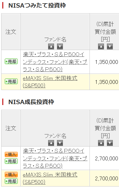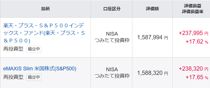 新NISA単体で見てもまだ含み益が残っています。楽天S&P500とeMAXISSlimS&P500では徐々に成績に差が出てきています。